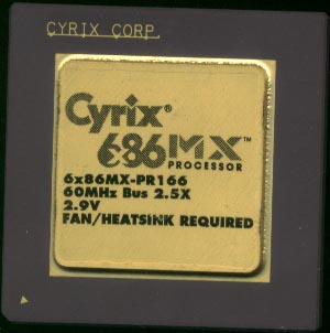 The 6x86MX and MII are closely based on the 6x86 with a few additions: MMX Support Support for more multipliers L1 Cache increased to 64K (from 16K) Doubled the Branch prediction. (to 512 entries) 32-bit optimizations 256 bytes Intruction cache (pre-L1 cache) ----------------------------------------- The Cyrix MX design was used by: IBM National Semiconductor -------------------------- Actual Speed: 150 Bus Speed: 60 Multiplier: 2.5 Fab'd By: IBM ----------------------------
