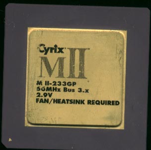 The 6x86MX and MII are closely based on the 6x86 with a few additions: MMX Support Support for more multipliers L1 Cache increased to 64K (from 16K) Doubled the Branch prediction. (to 512 entries) 32-bit optimizations 256 bytes Intruction cache (pre-L1 cache) ----------------------------------------- The Cyrix MX design was used by: IBM National Semiconductor -------------------------- Actual Speed: 200 Bus Speed: 66 Multiplier: 3 Fab'd By: National ----------------------------